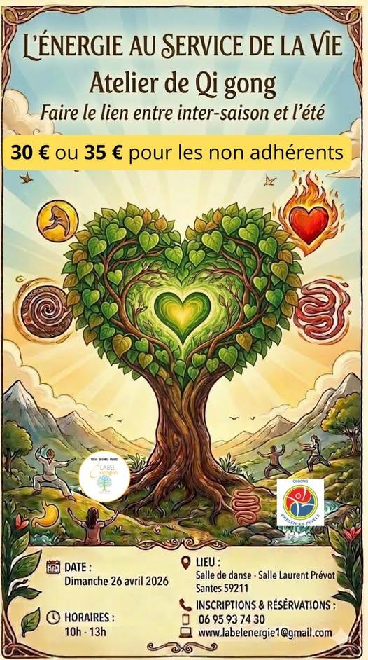 L'association LABEL Energie Santes vous propose un stage de Qi gong le dimanche 26 avril de 10h à 13h à la Salle Laurent Prévost rue Koenig. 30€ ou 35€ pour les non-adhérents.